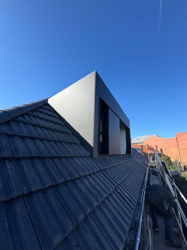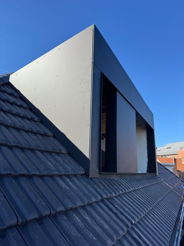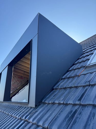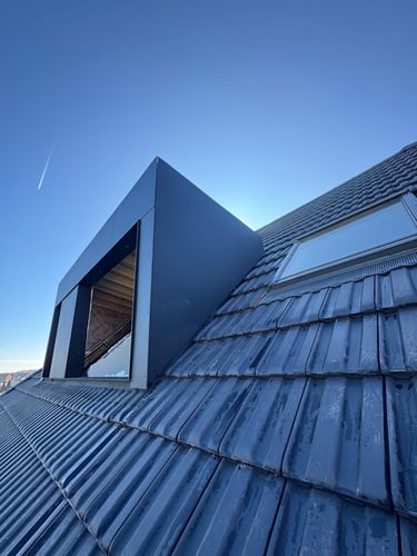 Rénovation et isolation d'une toiture en tuile terre cuite avec grande lucarne réalisée en ossature bois recouverte d'un bardage en Trespa.